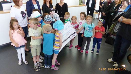 Der Schauerheimer Kindergarten „Kleine Welt“ freut sich über die 500 Euro-Spende – überreicht von Rummel-Geschäftsführerin Anette Richter