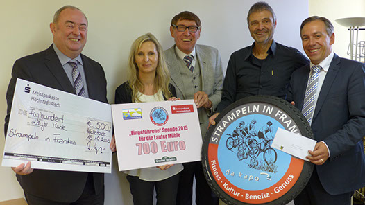 Landrat und Schirmherr Weiß übergibt zusammen mit Strampeln-in-Franken-Organiator Schuh die symbolischen Schecks.